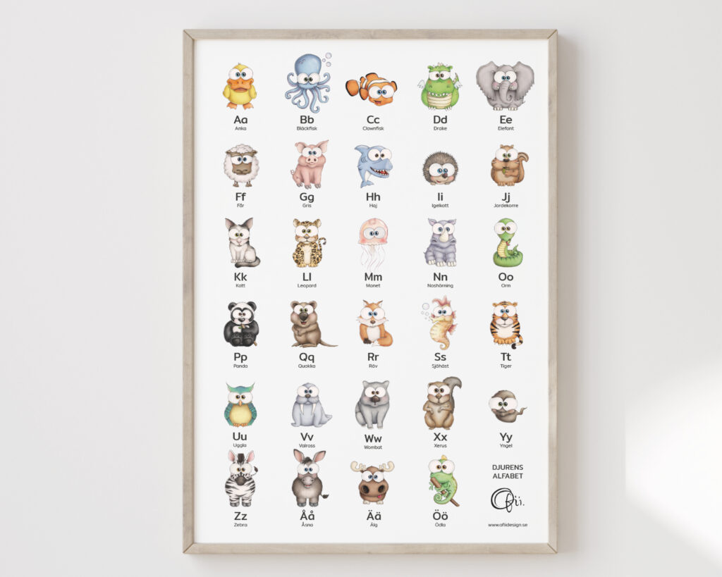Perfekt för barnrummet som inte har plats för 50×70-affischen. Låt barnen öva på både bokstäver och djur med djurens alfabet.